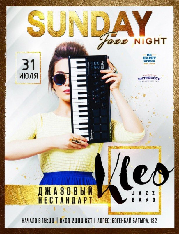 «KLEO JAZZ BAND с программой «Джазовый Нестандарт» — это будет вечер ярких экспериментов в стиле джаз. Вы услышите хиты поп и рок музыки в новых для себя звучаниях. Сумасшедшие эмоции от смеси жанров swing, be-bop, funk, bossa, lounge. Ожидайте неожиданного 31 июля на Sunday Jazz Night!