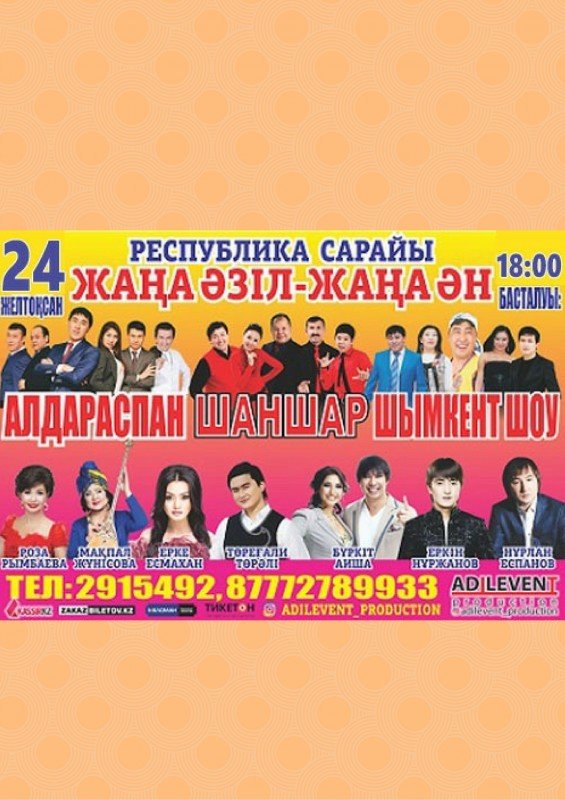 17 желтоқсан еліміздің бас сахнасы – Республика сарайында сағат 17.00-де Мерекеге арналған "Алдараспан Шаншар Шымкент шоу"- концерті өтеді ! Кеш Қонақтары :Роза Рымбаева, Мақпал Жүнісова, Ерке Есмахан,Төреғали Төреалі, Бүркіт Аиша, Еркін Нуржанов, Нұрлан Еспанов.Жеті жасқа дейінгі балалар концертке жіберілмейді