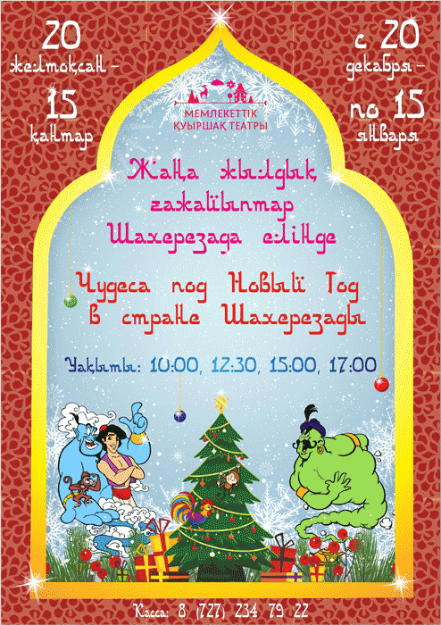«Чудеса под Новый год в стране Шахерезады»: в фойе театра у новогодней елки Вас встретят сказочные персонажи Аладдин, Будур, Джин, Волшебная лампа, торговцы, а также Дед Мороз со Снегурочкой.
