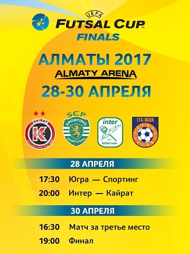 28 и 30 апреля 2017 г. на "Алматы Арене" за главный трофей Европы сразятся "Спортинг" (Португалия), "Интер" (Испания), "Газпром-Югра" (Россия) и АФК "Кайрат" (Казахстан)!