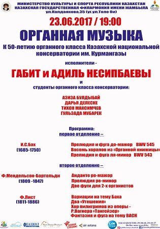 23 июня в зале консерватории имени Жамбыла состоится концерт, посвящённый 50-летию органного класса.