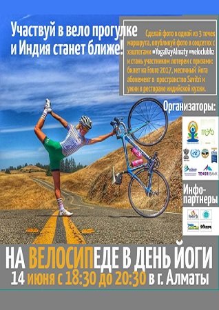 Накануне Всемирного дня йоги, алматинские велосипедисты смогут принять участие в велосипедной прогулке в поддержку этого события.