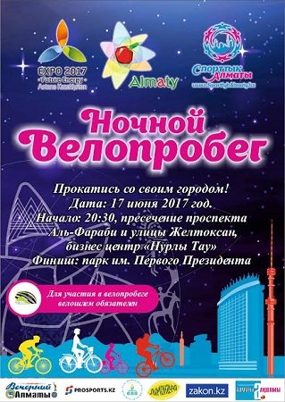 В субботу, 17 июня, в рамках масштабной программы «Спорттық Алматы» в городе состоится первый в этом году ночной велопробег.