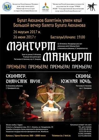 Балет «Манкурт» — балет на музыку Н. Закирова по роману Ч. Айтматова «И дольше века длится день». Спектакль основан на историческом сюжете и развивается в жанре лирической трагедии. Языком современной хореографии балет повествует о любви, бессмысленной вражде людей, их порабощении, взаимоотношениях человека и неземного. Главный конфликт – противостояние народностей, возвеличивание одних над другими и борьба человека против того, чтобы быть зомбированным. ПРЕМЬЕРА!