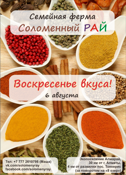 Семейная ферма «Соломенный рай» приглашает вас отдохнуть всей семьей на природе: пройти уникальный яркий кулинарный мастер-класс по вегетарианской кухне от профессионального повара с 30-летним стажем, Татьяны Казариновой; смастерить полезную вещицу из дерева в дружеской мужской компании с опытными мастерами-столярами; после совместного пира прогуляться на экскурсию по живописным ландшафтам соседних поместий экопоселения «Алмарай» и, при желании, накупаться в просторном бассейне на открытом воздухе! Цена за однодневное участие (с 10.00 до 17.00): взрослые - 7000 тг., дети с 6 до 14 лет - 5000тг, и дети младше 6 лет - бесплатно. В стоимость входит завтрак, полноценный вегетарианский обед, участие в мастер-классах, общение с кроликами, детский бассейн. Экскурсии, эко-магазинчик, бассейн для взрослых по воскресеньям и другие услуги дополнительно. Предварительная регистрация обязательна по телефону +7 777 2610798 (Маша). Количество мест ограничено (в среднем не более 25 участников в день). Наш адрес: Экопоселение Алмарай, 30 км от Алматы (~1час езды на машине), рядом с п.Жалкамыс (за поворотом на «8 озер»). При необходимости мы готовы организовать транспорт из города. Наши контакты: Тел (whatsapp): +7 777 2610798 Email: [email protected] vk.com/solomenyray facebook.com/solomenyray ПОДРОБНАЯ ПРОГРАММА на 6 августа 2017г. 10.00 - 11.00 Встреча участников программы, легкий фуршет, знакомство, ознакомление с территорией. 11-00 - 13.00 Творческие мастер-классы: А) Кулинарный мастер-класс по вегетарианской кухне с Татьяной Казариновой У вас есть редкая возможность пройти кулинарный мастер-класс с Татьяной Казариновой - профессиональным поваром вегетарианской кухни со стажем более 30 лет, обучавшейся искусству ведической кулинарии в Индии. Татьяна обучает очень доступно и живо, и щедро делиться своими знаниями и опытом! Если вы хотите готовить дома разнообразно, интересно и всегда вкусно, то этот мастер-класс создан прямо для вас! В процессе обучения мы вместе окунемся в незабываемую атмосферу приготовления пищи, полезной для тела и приятной сердцу! Мы научимся правильно и с пользой сочетать различные пряности, и, обязательно, получим вкус радости и любви от самого процесса приготовления вегетарианских блюд! Итак, мы будем готовить вместе: • Летний суп «Минестроне» с ведическими нотками :) • Рис «Чавал» • Чатни из помидоров • Котлетки из чечевицы • Салат из кабачков • Восточная сладость из фиников по авторскому рецепту • Напиток из местных трав Весь кухонный инвентарь и фартуки будут предоставлены организаторами. Возьмите с собой только свои кулинарные тетрадки, чтобы записать рецепты блюд и, конечно же, хорошее настроение. Б) Мастер-класс для мальчиков и мужчин «Добрые вещи своими руками» с Рустемом, Азаматом и Германом На занятии участников ждет знакомство и получение практических навыков по работе с различными видами инструментов, такими как отвертка, молоток, дрель, ножовка и другими электрическими и ручными инструментами. В результате мастер-класса взрослый с ребенком сможет сделать скворечник, домик для насекомых или другую полезную вещь для дома (полочку, табуретку и т.п.). Подробнее: https://web.facebook.com/solomenyray/posts/7864301948..https://vk.com/solomenyray?w=wall-148480129_35%2Fall 13.00 – 14.30 Совместный вегетарианский обеденный пир. Отдых. 14.30 – 15.30 Беседы - 9 лет опыта жизни в экопоселении (для всех желающих), детский бассейн 15.30 – 17.00 Варианты пеш