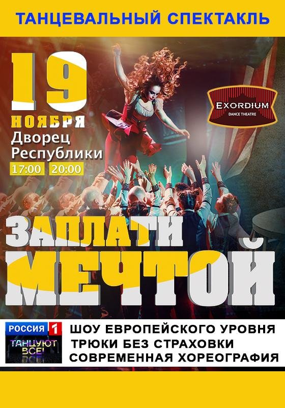 ВПЕРВЫЕ В КАЗАХСТАНЕ! Участник масштабного телепроекта "Танцуют все!", полюбившийся миллионам зрителей! "EXORDIUM" - уникальный театр танца в России, сочетающий танцевальное, цирковое и драматическое искусство готов рассказать зрителю необыкновенно красочную историю языком танца! Танцевальный спектакль "Заплати МЕЧТОЙ" откроет вам восхитительный мир, полный настоящих, живых эмоций, мурашек и вдохновения!