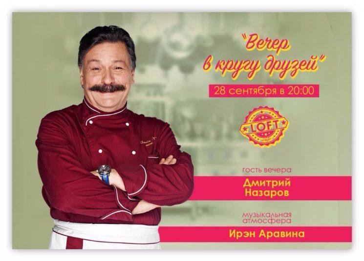 «Вечер в кругу друзей» предвкушает собой настоящую душевную беседу с участием харизматичного российского актера Дмитрия Назарова. Встреча состоится под аккомпанемент несравненной Ирэн Аравиной, которая добавит в этот вечер томные нотки живого джаза, а шеф-повар ресторана удивит палитрой вкуса одним из двух своих авторских сетов.