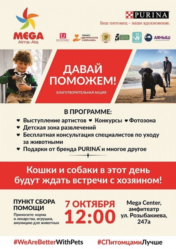 В Алматы в амфитеатре ТРЦ «MEGA Center Alma-Ata» пройдет благотворительная акция «Давай поможем», направленная на поддержку и поиск любящих хозяев для животных из казахстанских приютов. Мероприятие организовано брендом кормов для домашних животных Purina совместно с благотворительными фондами «Котопес», «Аяныш», «Новый Шанс» и приютами «Помощь Бездомным Животным», «Дос», «Дворянское собрание». Официальный партнер мероприятия – ТРЦ «MEGA Center Alma-Ata».