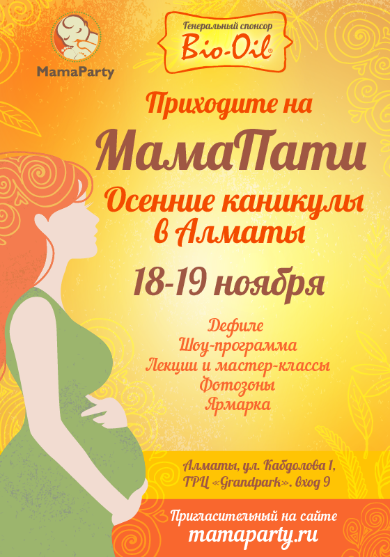 Генеральный спонсор «Осенних каникул в Алматы» - компания Bio-Oil. Наверняка, все будущие мамы знакомы с этим волшебным маслом, спасающим от растяжек и следов от них. Если вы еще не знаете этот продукт, обязательно познакомьтесь с ним на МамаПати: там обязательно будет локация бренда, где вам подробно расскажут о действии масла, о его составе и влиянии на кожу. А если вы примете участие в активностях, предусмотренных программой праздника, то у вас будет возможность получить масло Био-ойл в подарок от нашего генерального спонсора! Два удовольствия в одном – и развлечение, и полезный приз!