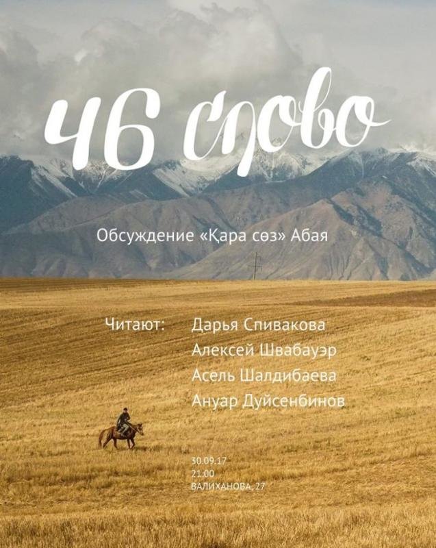 На этот раз лекции не будет. Вместо этого участники чтений прочитают по отрывку из «Қара сөз» Абая и расскажут почему это слово им важно, какие вопросы вызывает, о чем заставляет думать, в чем актуальность этого слова по сей день. Таким образом и мы с вами вспомним эти замечательные и несправедливо забытые тексты. Лекции продолжим в октябре.