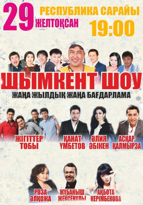 Концерт под названием "Шымкент Шоу" состоится 29 декабря во Дворце Республики. Начало в 19:00.