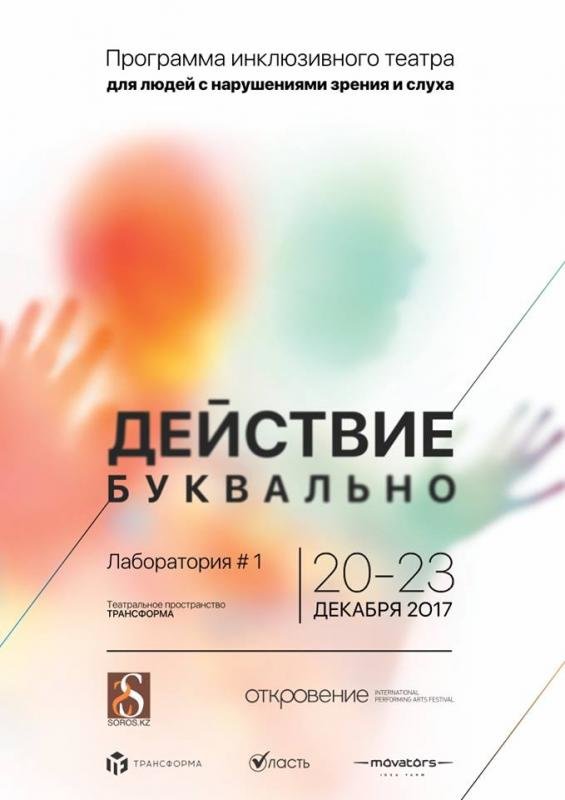 С 20 по 23 декабря, в Алматы, в театральном пространстве «Transforma» (культурное пространство «SmArtPoint»), пройдет первый этап большой программы инклюзивного театра, организатором которой стал международный фестиваль исполнительских искусств «Откровение»при поддержке Фонда Сорос – Казахстан. Программа «Действие буквально» рассчитана на полгода и пройдет в несколько этапов.