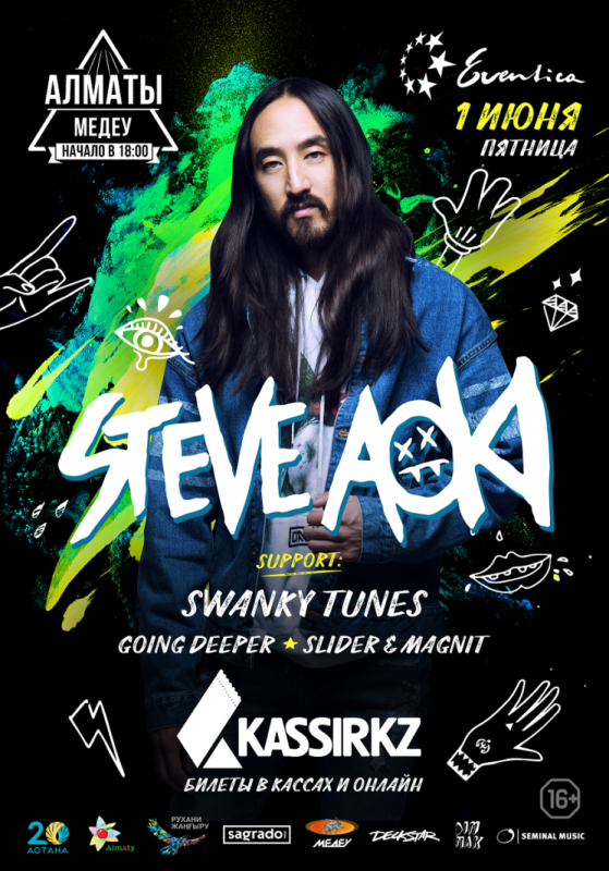 1 июня в Казахстан возвращается Стив Аоки; американский диджей и продюсер, номинант премии Grammy и непременный участник рейтинга Top 100 DJs журнала DJ Mag. После невероятного шоу на Expo 2017 в Астане Стив готов удивить своим сетом гостей высокогорного спортивного комплекса «Медео». На этом многочасовом open air-марафоне вместе с Аоки выступят герои мировых танцевальных чартов: российское EDM-трио Swanky Tunes, питерские хитмейкеры Slider & Magnit и Going Deeper.