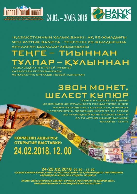 — 24-25 февраля с 9.30 до 17.30 – Центральный государственный музей РК и АО «Народный Банк Казахстана» в рамках Фестиваля «95 Добрых дел» проведут Акцию«День открытых дверей». В эти дни посетителям предоставляется возможность бесплатного посещения 4-х экспозиционных залов музея: «Палеонтология и археология», «Историческая этнография», «Казахстан в годы Великой Отечественной войны и культура диаспор», «Современный Казахстан» и выставки «Звон монет, шелест купюр (Тенге в потоке истории)», по экспозиции которой экскурсоводы музея проведут бесплатные экскурсии на казахском и русском языках.