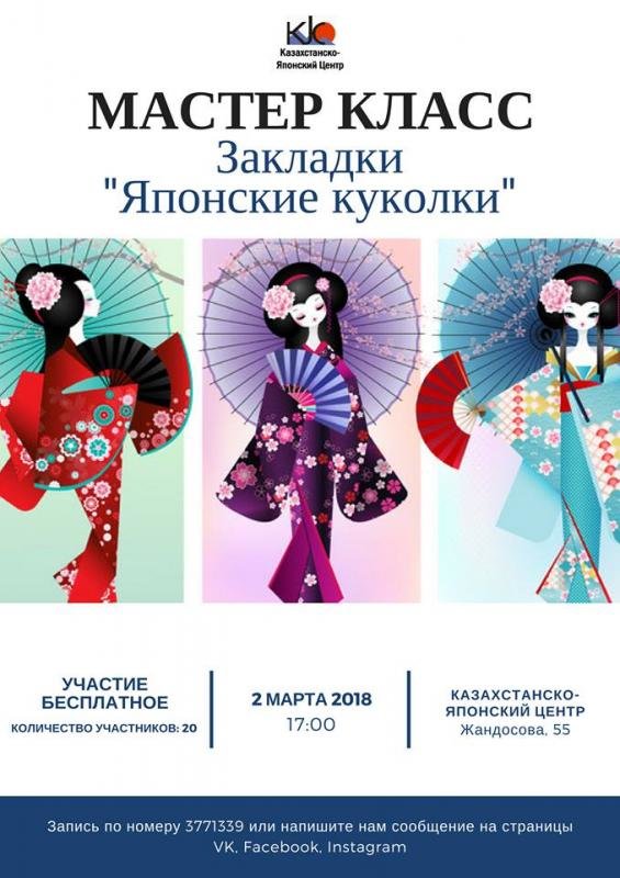 Бесплатный прикладной мастер-класс по изготовлению закладок "Японские куколки" пройдет в Казахстанско-японском центре развития человеческих ресурсов 02 марта в 17:00.