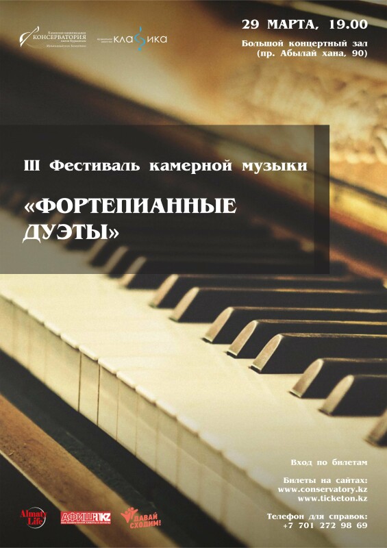 29 марта в 19.00 в Большом концертном зале Казахской национальной консерватории имени Курмангазы в рамках III фестиваля камерной музыки состоится концерт «Фортепианные дуэты».