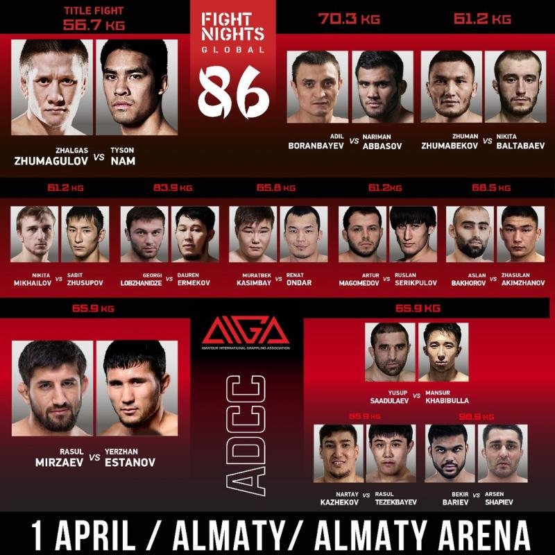 Напомним, что 1 апреля в многофункциональном комплексе Almaty Arena состоится международный турнир по смешанным единоборствам Fight Nights Global 86. В главном бою данного вечера между собой встретятся экс-претендент на пояс чемпиона FN GLOBAL Жалгас «Жако» Жумагулов и автор самой главной сенсации 2017 года, Тайсон Нэм из США.