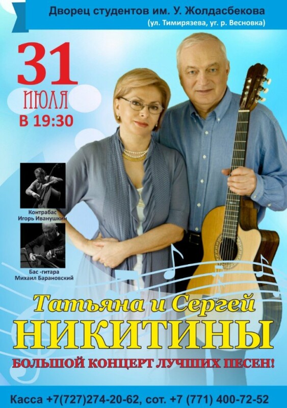 Дорогие друзья, 31 июля,во Дворце студентов г.Алматы выступает дуэт Татьяны и Сергея Никитиных! Сергей Никитин как композитор, и дуэт Татьяны и Сергея Никитиных — сыграли ключевую роль в становлении жанра авторской песни в России и других странах бывшего Советского Союза. Не одно поколение слушателей в России,Казахстане и за рубежом выросло на песнях Сергея Никитина, а дуэт Татьяны и Сергея Никитиных известен не только как музыкальный коллектив, поющий поэзию, но и как явление русской советской и пост-советской культуры.