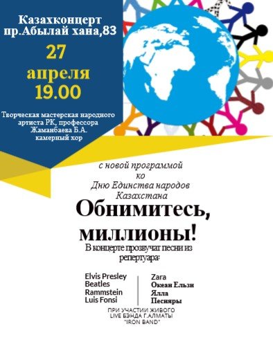 Арт-проект «Обнимитесь, миллионы!», написанный в жанре концерта с элементами мюзикла, основан на синтезе различных музыкальных стилей и жанров. Одной из задач арт-проекта является отображение не только музыки различных народов, но и разных музыкальных периодов: от хитов 60-ых годов прошлого века («Дос-Мукасан», «Ялла», «Песняры», музыка из советских кино и мультфильмов, Элвис Пресли, «Beatles») до музыки нынешних дней («Жігіттер», Rammstein. Океан Ельзи, Luis Fonsi, Зара, Дмитрий Певцов, др.). Все хиты исполняются смешанным хором под сопровождение одной из популярных алматинских лайф-групп «Iron Band». В проекте также принимают участие известные этно-музыканты г. Алматы, и лауераты городских и республиканских конкурсов «Юнный музыкант», «Куншуак» детский хор мальчиков «Magic».