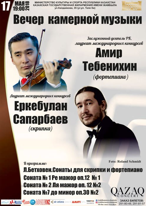 Исполнители: лауреаты международных конкурсов  А.Тебенихин (фортепиано), Е.Сапарбаев ( скрипка).
