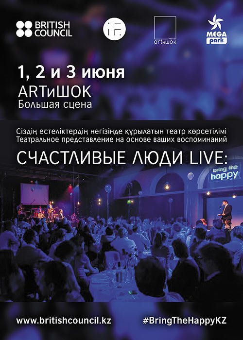 C 27 апреля по 25 мая 2018 года British Council в Казахстане и интерактивная арт-студия Invisible Flock из города Лидс (Великобритания) при поддержке театра ARTиШОК представят грандиозный инновационный проект «Счастливые люди». В торгово-развлекательном центре Mega Park в Алматы будет установлена 3D-инсталляция в виде карты города, на которой люди будут отмечать места, где они были счастливы. Самые удивительные истории будут представлены в музыкальном спектакле «Счастливые люди Live», который пройдет с 1 по 3 июня на Большой сцене театра ARTиШОК.