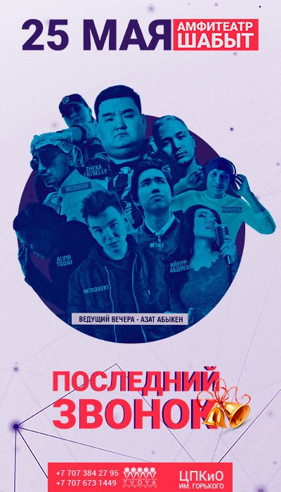 25.05.2018 года в Центральном парке им. Горького в Летнем Амфитеатре «Шабыт» состоится Музыкальный фестиваль под названием «Последний Звонок» посвященный всем выпускникам города Алматы.