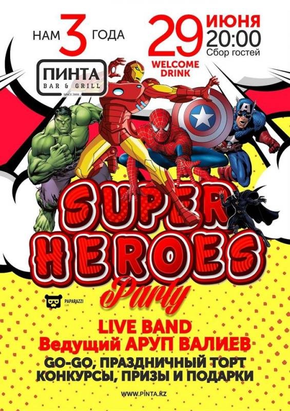 Вас ждет шоу-программа, живая музыка, конкурсы, призы и подарки. А также, welcome drinks, go-go, праздничный торт, и конечно же, настоящие супергерои и памятные фотографии.