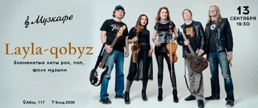 Четверг. 13 сентября. Кобыз и блестательная группа @layla.qobyz! Вне шаблонов и привычных музыкальных схем. Весь вечер хиты рок, поп, фольк-музыки.