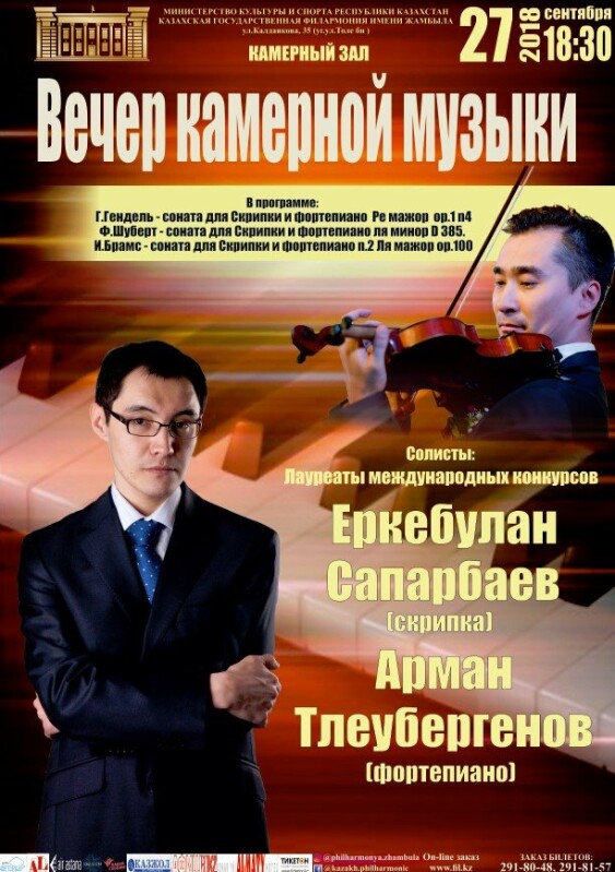 Солисты: Лауреаты международных конкурсов - Еркебулае Сапарбаев, Арман Тлеубергенов.