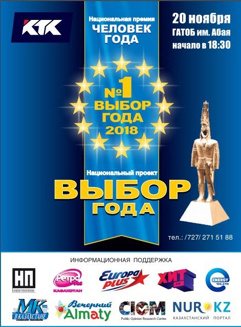 В Казахском Государственном академическом театре оперы и балета им. Абая состоится девятнадцатая ежегодная церемония награждения победителей с вручением главных призов проекта «Человек года» - статуэтки «Алтын Адам», и почетных медалей «Общественное признание» и «№1 Выбор года».