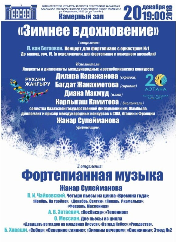 Солистка Казахской государственной филармонии им. Жамбыла, дипломант и призер международных конкурсов в США, Италии и Франции — Жанар Сулейманова (фортепиано)