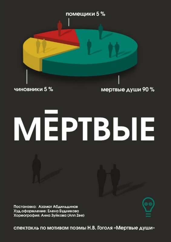Наш новый спектакль, поставленный по мотивам произведения Гоголя "Мёртвые души", докажет, что, как ни прискорбно, история, написанная ещё в 19 веке, довольно точно отображает наши сегодняшние реалии. В толпе (государстве) обязательно найдется подхалим-Манилов, религиозная Коробочка и до скрипа скупой Плюшкин, но мы предпочли назвать это сатирической фантазией и дать зрителю самому для себя решить, сколько же на сцене жизни.