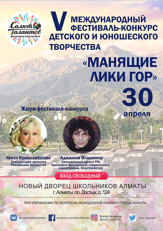 Приглашаем принять участие V Международном фестивале-конкурсе детского и юношеского творчества «Манящие лики гор», который состоится 30 апреля 2019 года в городе Алматы.