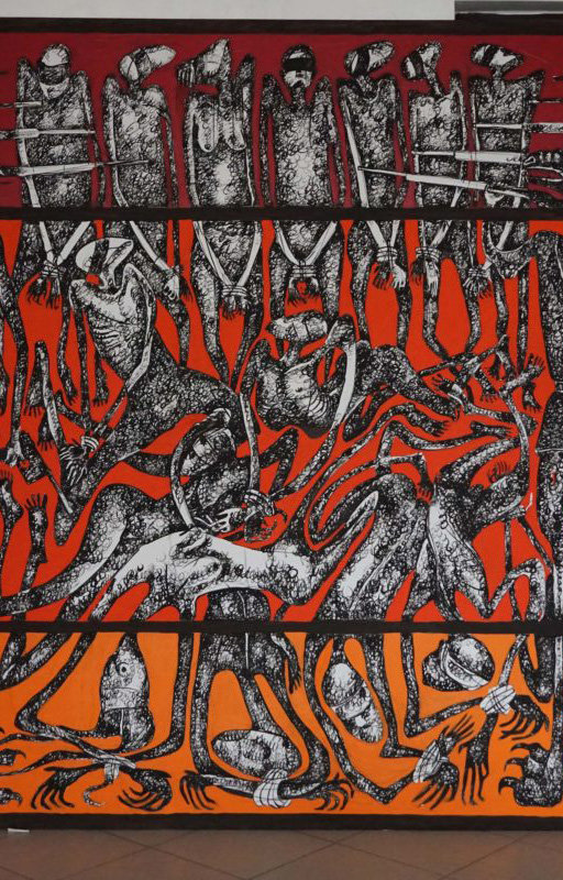 В работах Оразбека можно увидеть тягостные трагические события нашего прошлого через сложные многофигурные композиционные решения. Фигуры вытянуты в длинные протуберанцы в желании взлететь, либо закручены в тугие спирали от боли и жажды. В этой борьбе, игре жизни и смерти, нет главных героев, как и сложно отличить, что здесь зло или добро.
