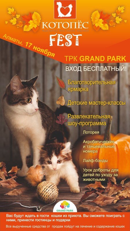 Первый фестиваль KotoPes Fest. Праздник для всей семьи с мастер-классами, конкурсами, подарками, выступлениями артистов, ярмаркой ручных изделий, уроком доброты для детей по уходу за животными, лотереей, а так же комнатой общения с кошками из приюта.