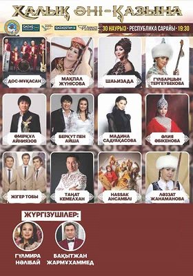 На вечере «Халық әні-қазына» для слушателей выступят такие именитые исполнители отечественной эстрады как «Дос-Мукасан», Макпал Жунусова, Мадина Садвакасова, Беркут и Айша.