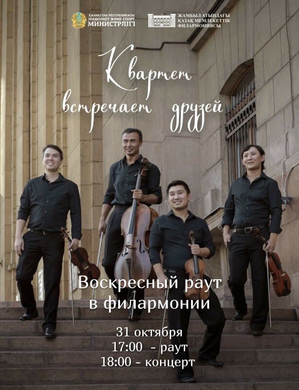31 октября в 17:00 состоится воскресный раут в Филармонии. Вас будет встречать Государственный струнный квартет им. Г. Жубановой. Художественным руководителем квартета является заслуженный деятель РК Ернар Мынтаев.