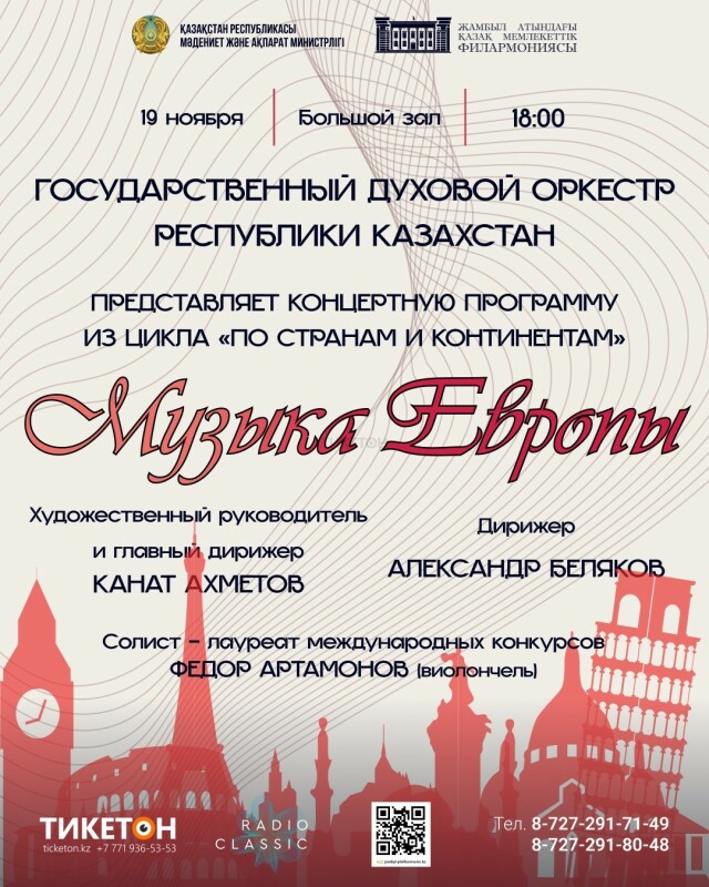 19 ноября 2023 года в 18.00 в Большом зале Казахской государственной филармонии им. Жамбыла состоится концерт Музыка Европы» Из цикла «По странам и континентам» с участием Государственного духового оркестра РК. Художественный руководитель и главный дирижер оркестра– Заслуженный деятель РК, Кавалер ордена «Құрмет» Канат Ахметов. Дирижеры: Заслуженный деятель РК, Кавалер ордена «Құрмет» Александр Беляков, Жанат Абылкасымов