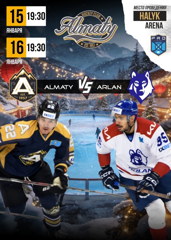 Новогодние праздники позади. Пора на хоккей! Хоккейный клуб «Алматы» проведете первые матчи в 2026 году. Соперником нашей команды станет хоккейный клуб «Арлан» из Кокшетау. Матчи пройдут в ледовом комплексе Halyk Arena, начало в 19:30.