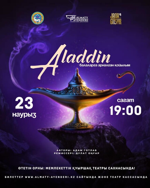 Байлық пен бақыт… Адалдық пен зұлымдық… Аладдин мен Әбудің таңғажайып оқиғалары. Қатыгез Джаффардың ойлағаны билік пен байлық. Ал, Аладдин болса Жасмин ханшайымды ұнатады. Джин олардың тілегін орындай алды ма? Әмірші Сұлтан қандай шешім қабылдады? Шытырман оқиғаларға толы “Аладдин” балалар ертегісін бірге тамашалайық!