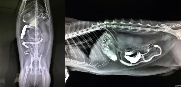 - Лабрадор, 2 года: постоянная рвота, но рентген чист. КТ выявил пластиковую крышку от бутылки, застрявшую в пилорическом отделе желудка. Успешно удалена хирургически.