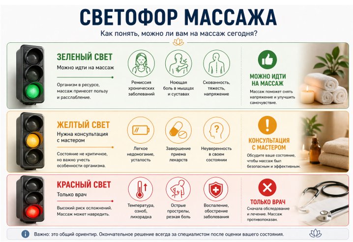 Главное правило — никогда не начинать курс в фазе острого воспаления. Если вы чувствуете «прострелы», резкую боль при малейшем движении или онемение конечностей, массаж может только усугубить отек тканей. В этот момент организм и так перегружен попытками стабилизировать поврежденный участок, и любое внешнее давление станет лишним стрессом для системы. Массаж идеален в период ремиссии или при стихании болей, когда нужно «разгрузить» уставшие мышцы и подготовить их к нормальной работе.